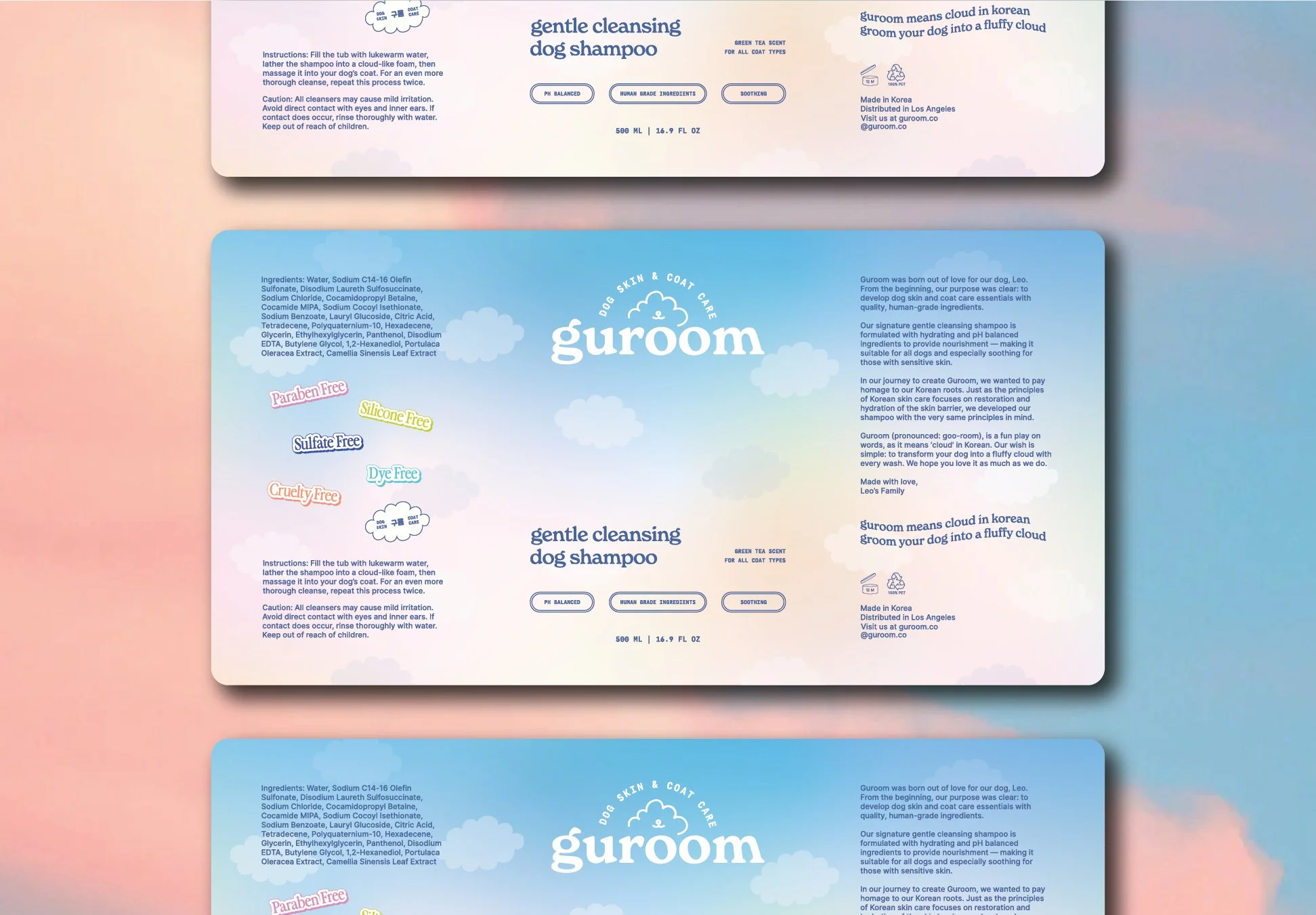 Guroom is a dog skin and coat care essentials brand born out of love, intention, and a deep personal journey. Inspired by their dog Leo’s early health struggles, the founders — a husband and wife duo based in Los Angeles — set out to create a shampoo they could trust just as much for themselves as for their pup. The result is Guroom: a gentle, high-quality, thoughtfully crafted line of dog care products designed with clean ingredients, Korean heritage, and fluffy cloud dreams in mind. Even the name “Guroom” (구름), meaning “cloud” in Korean, reflects their vision of grooming every pet into a fluffy cloud of love.