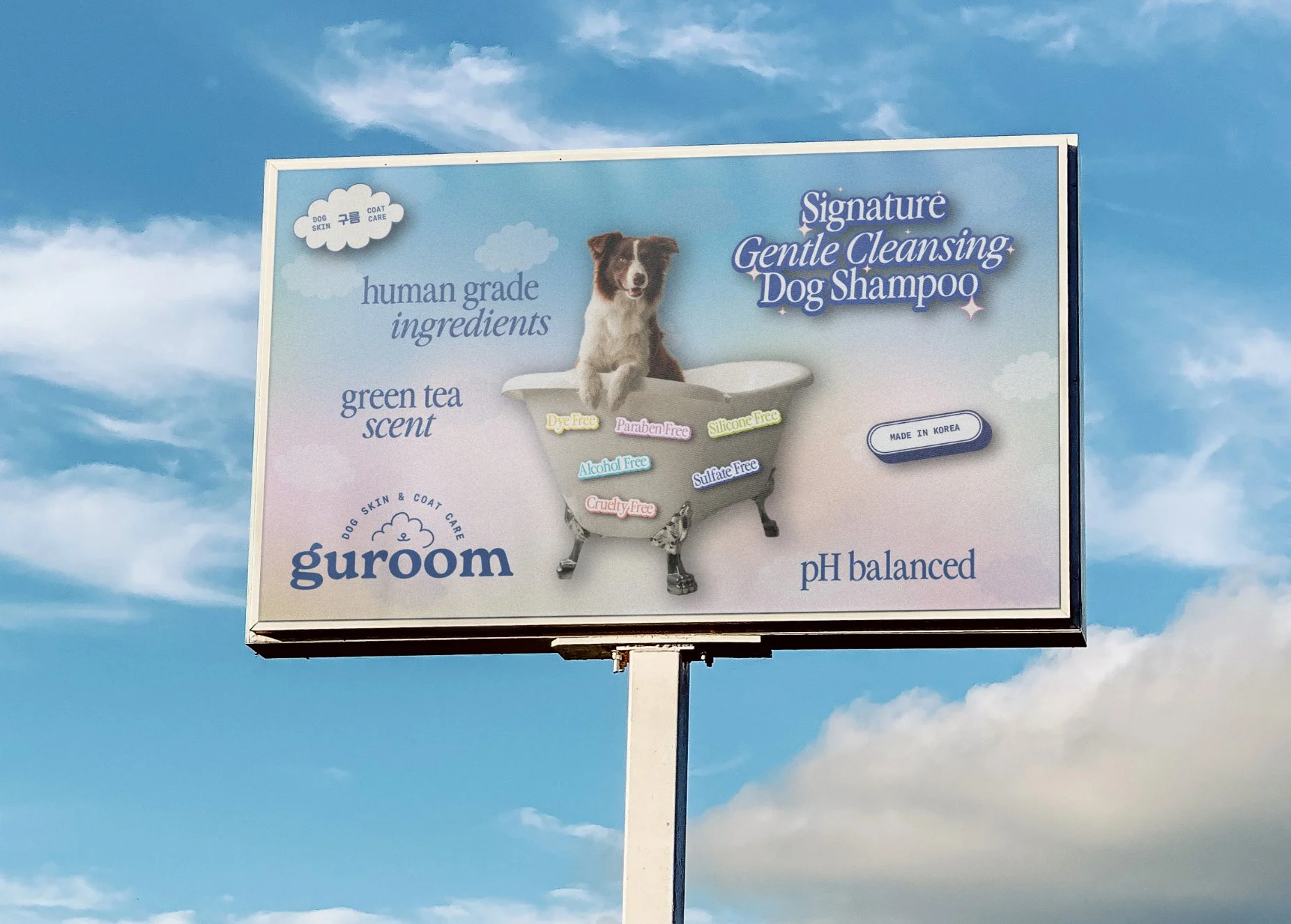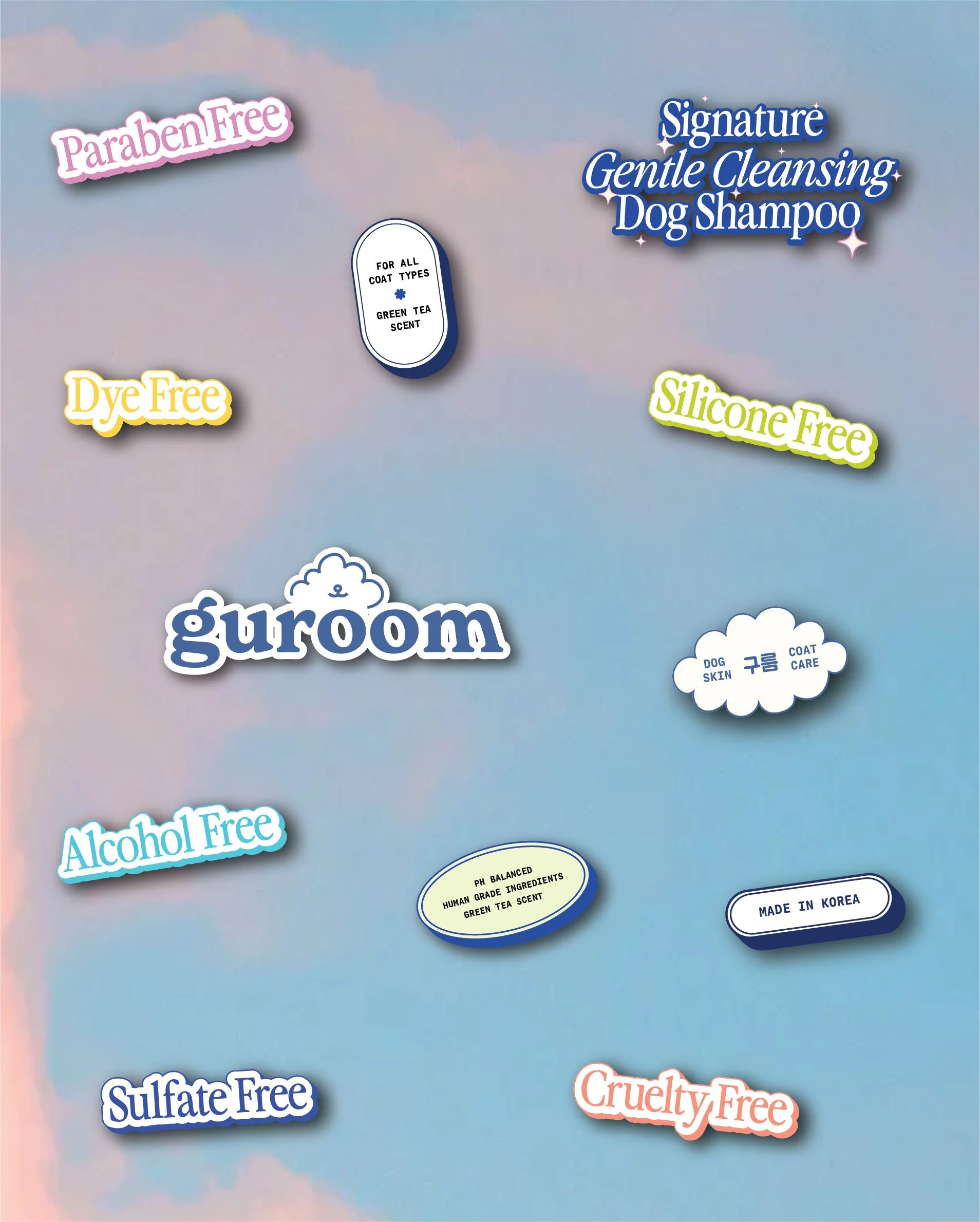 We approached this by developing a logo that seamlessly blends meaning with charm: a minimalist cloud illustration that subtly includes a dog’s nose and mouth — uniting Guroom’s name, its Korean meaning, and its core product all in one. For the color palette, we leaned into soft pastel blues, pinks, peaches, and yellows to mimic the colors of a dreamy sky, evoking both calm and joy.